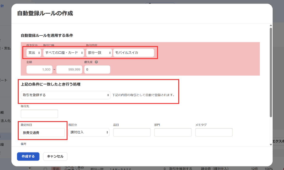 例えば「モバイルスイカ=旅費交通費」などのルールを一度登録しておけば、以降はfreeeが自動で仕訳を行ってくれるため、日々の経理負担が大幅に軽減されます。