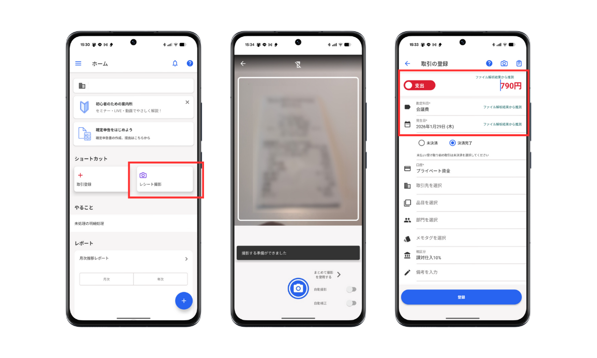 スマホでレシートを撮影するだけで、AIが日付・金額・支払先を読み取り、仕訳候補を提案してくれます。 面倒な手入力がほぼ不要になるため、スキマ時間の入力がぐっと効率的に。